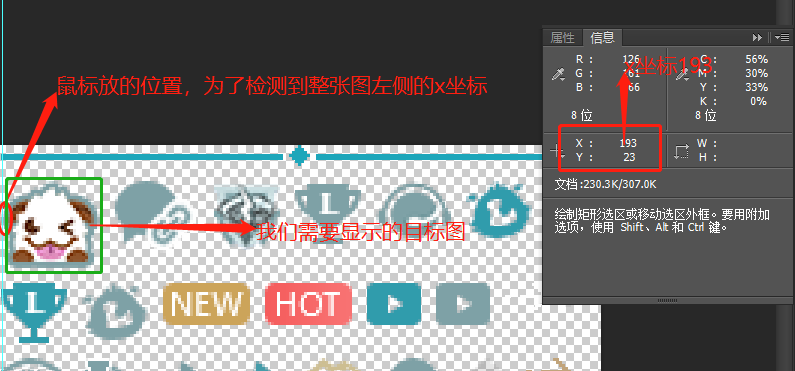 首先用PS把这张图片打开,默认会将这张图片定位到原点坐标上。需要展示精灵图上的某张小图,只需要选中该图,或者用辅助线确定好该图的边线。按下F8,右侧会出现当前鼠标所在的坐标。