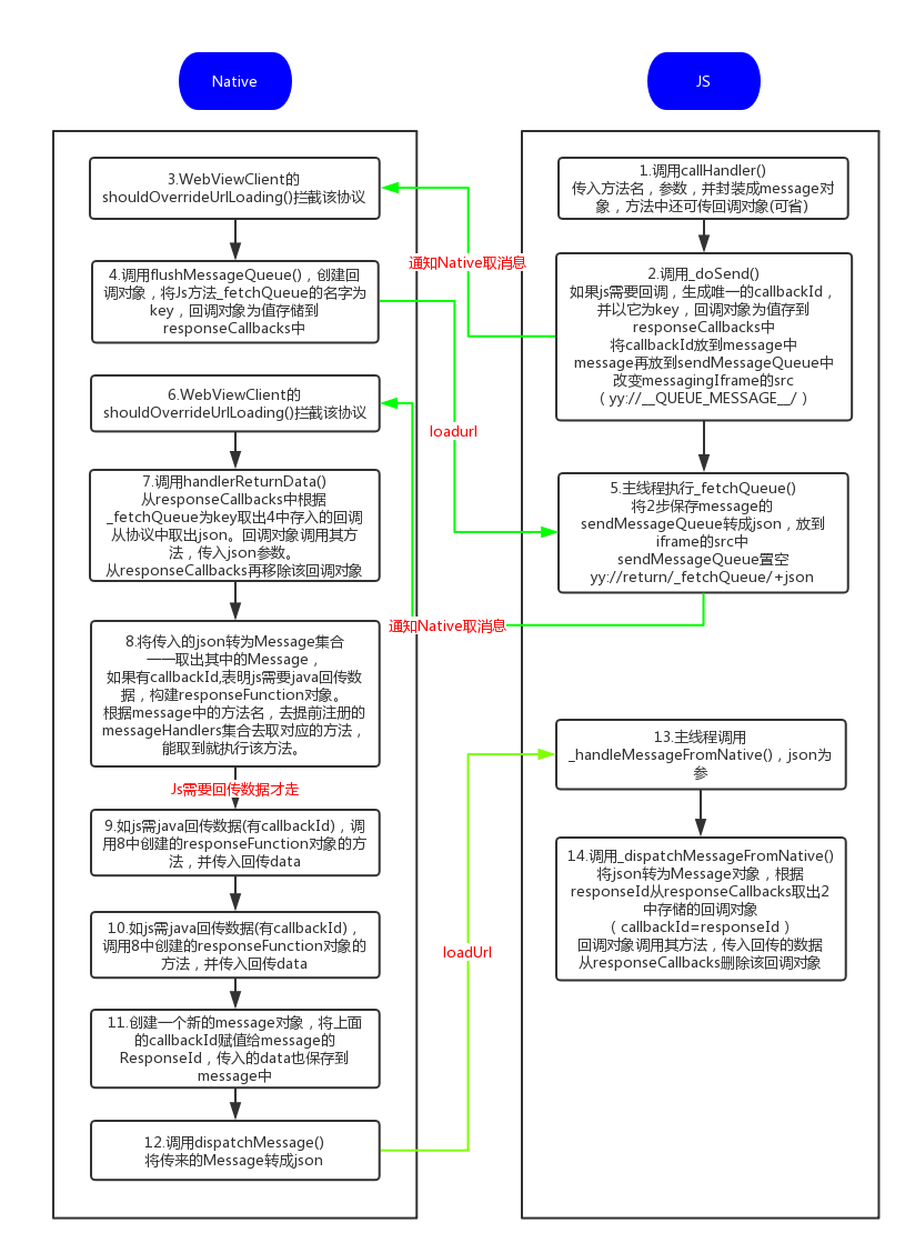 }到这里Native调用js分析完毕。从整个流程来看,Native消息通知JS很方便,直接调用就好了。而Js由于不能直接通知给Native,所以相对来说比较绕,得先通过协议拦截的方式通知Native JS有消息要传递,然后Native再主动调用Js的方法,将Js要传递的消息再通过协议拦截的方式传递给Native。